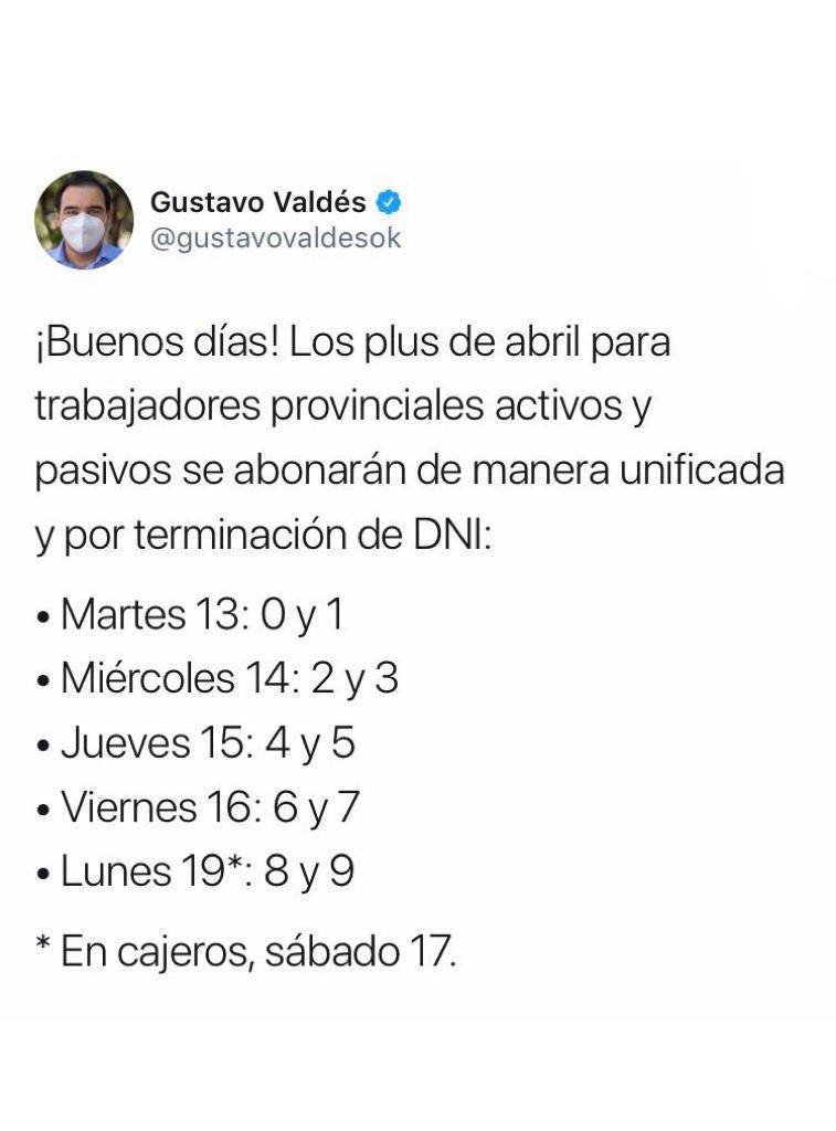 A través de su cuenta de Twitter, el gobernador Gustavo Valdés anunció el cronograma de pago del plus unificado para trabajadores provinciales activos y pasivos.