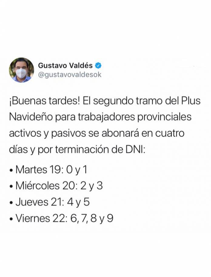 El gobernador Gustavo Valdés anunció este sábado que a partir del martes 19 se pagará el segundo tramo del plus navideño para trabajadores provinciales activos y pasivos. Esta vez se abonará los restantes $7.000 de un total de $10.000, cuyo primer tramo de $3.000 se pagó junto al suelo de diciembre.