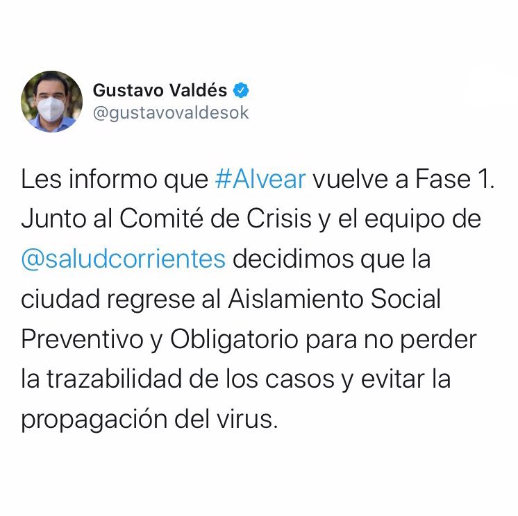 El gobernador de la provincia, Gustavo Valdés anunció en su cuenta de twitter, que la localidad de Alvear vuelve a la Fase 1 y que contempla el Aislamiento Social Preventivo y Obligatorio. La decisión fue tomada en conjunto entre el Comité de Crisis y ministerio de Salud por el caso registrado ayer y con el objetivo de “no perder la trazabilidad de los casos y de esa forma evitar la propagación del virus” agregó en su cuenta.