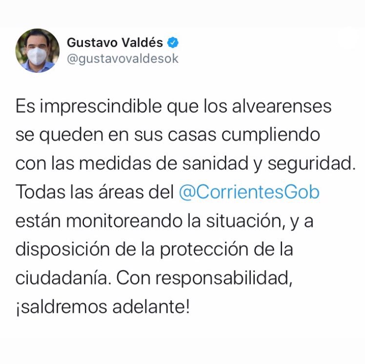 Por último, remarcó y pidió a los lugareños que “es imprescindible que los alvearenses se queden en sus casas cumpliendo con las medidas de sanidad y seguridad” y aseguró que todas las áreas del Gobierno de Corrientes están monitoreando la situación, y a disposición de la protección de la ciudadanía finalizó su twitter.