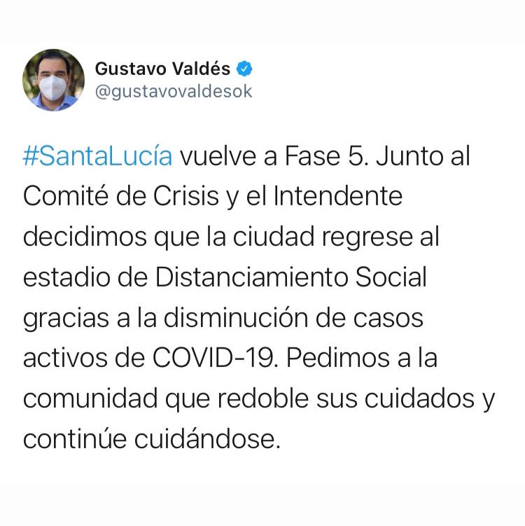 El gobernador Gustavo Valdés anunció este lunes por la mañana que la localidad de Santa Lucía vuelve a Fase 5. La decisión fue tomada junto al Comité de Crisis y el intendente José Sananez a raíz de la disminución de casos activos de Covid-19, según expresó el mandatario en su cuenta de Twitter. “Pedimos a la comunidad que redoble sus cuidados”, agregó.