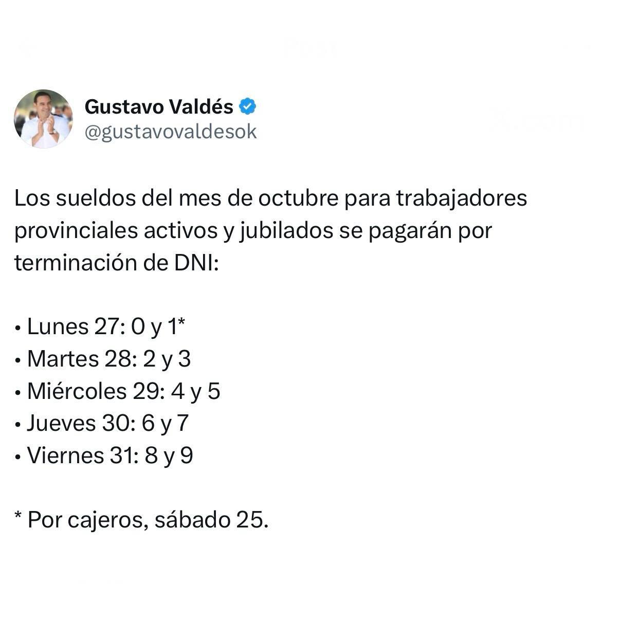 A través de sus redes sociales, @gustavovaldesok, comunicó el pago del sueldo de octubre a los agentes de la administración pública provincial, activos, jubilados y pensionados. El cronograma se extiende entre este lunes 27 y el viernes 31.