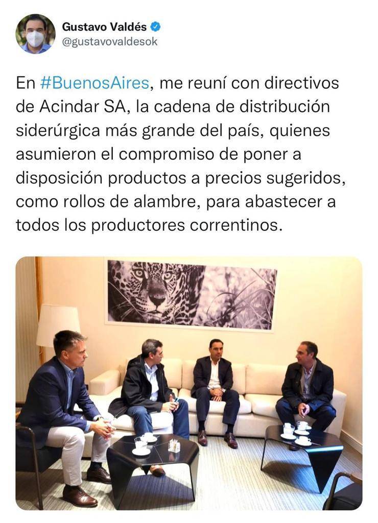 Este miércoles el gobernador Gustavo Valdés informó por medio de su Twitter oficial que “En Buenos Aires, me reuní con directivos de Acindar SA, la cadena de distribución siderúrgica más grande del país, quienes asumieron el compromiso de poner a disposición productos a precios sugeridos, como rollos de alambre, para abastecer a todos los productores correntinos”.