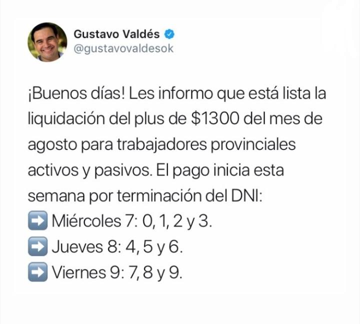 A través de su cuenta oficial de Twitter, el gobernador Gustavo Valdés confirmó el cronograma de pago del plus de $1300 para los empleados de la administración pública, tanto activos como jubilados y pensionados.