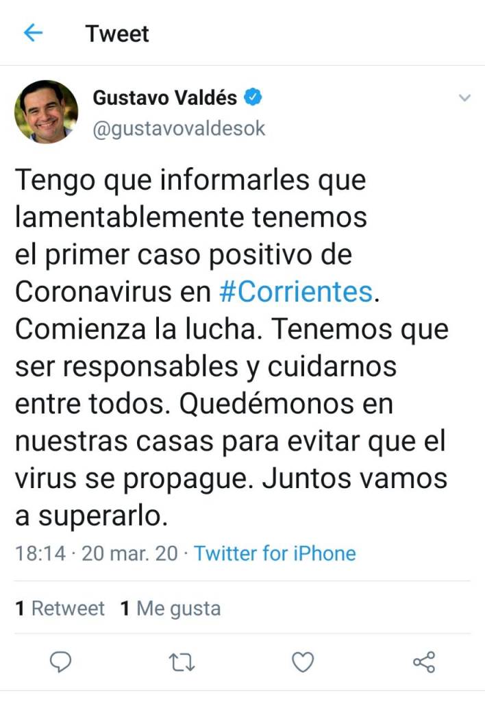 El gobernador Gustavo Valdés, fue el primero en dar a conocer esta lamentable noticia, quién también con gran determinación se dirigió a la comunidad a través de sus cuentas de redes sociales, para que redoble esfuerzos afirmando: ”tengo que informarles que lamentablemente tenemos el primer caso positivo de Coronavirus en Corrientes. Comienza la lucha. Tenemos que cuidarnos entre todos. Quedémonos en nuestras casas para evitar que el virus se propague. Juntos vamos a superarlo”.