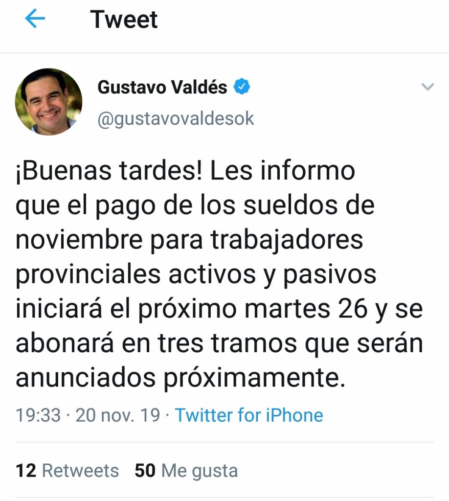 El gobernador Gustavo Valdés confirmó, a través de su cuenta de twitter (@gustavovaldesok), que el pago sueldos de noviembre iniciará el próximo martes 26 para trabajadores provinciales activos y pasivos. Los mismos se abonarán en tres tramos que serán anunciados en los próximos días.