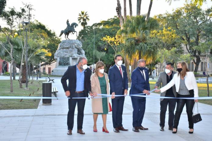 En la esquina de las calles Salta y 25 de Mayo, pasadas las 17, el Gobernador cortó las cintas de las obras que pusieron en valor esta plaza central, conservando el diseño original con sus diagonales e iluminación de farolas de fundición antiguas, entre otras características históricas. En la ocasión, el Mandatario estuvo acompañado por su esposa Cristina Garro; el intendente Tassano y su esposa Dora Malvina Bozzone; el ministro de Obras y Servicios Públicos, Claudio Polich; y el presidente del Instituto de Cultura, Gabriel Romero. Asistieron además al acto, funcionarios, legisladores y otras autoridades.