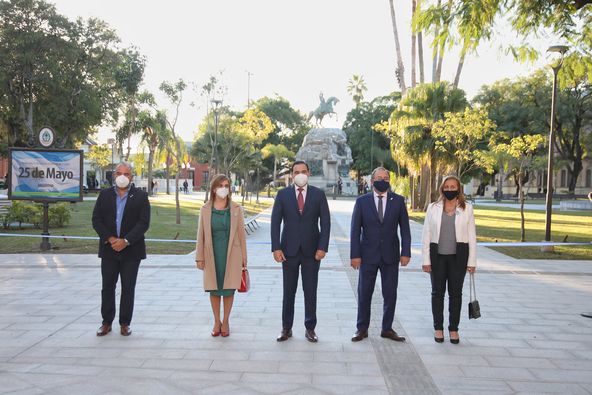 En su alocución, Valdés afirmó que “cuando comenzamos la construcción de esta plaza, nunca hubiésemos imaginado que estaríamos hoy en un contexto como éste, pero las obras continúan, y tenemos en el día de mañana la obligación de rememorar los primeros gritos de libertad de la República Argentina y vamos a estar nuevamente en este lugar histórico y para ello habíamos pensado remozar absolutamente esta Plaza que la venimos trabajando con cuidado y dedicación con expertos por eso hemos encomendado el trabajo a la empresa Panedile, que ha hecho un hermoso trabajo”.