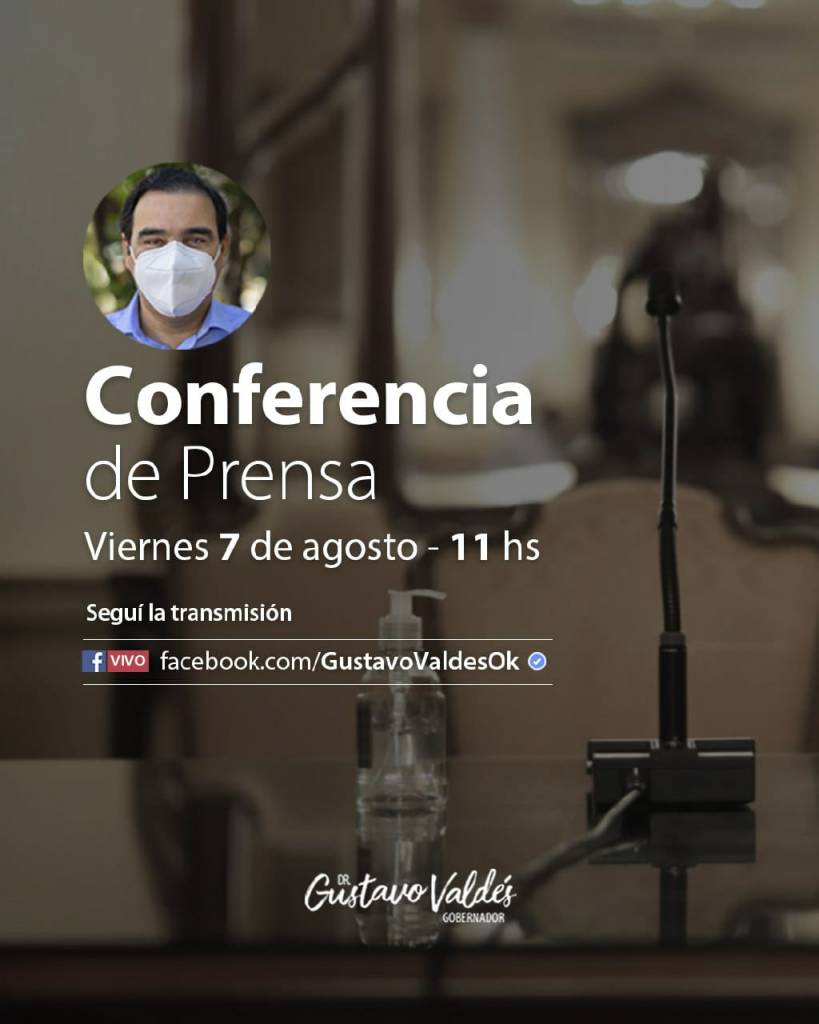 El gobernador Gustavo Valdés ofrecerá una conferencia de prensa, este viernes a las 11 en el Salón Amarillo de Casa de Gobierno, para dar a conocer temas de interés general a la ciudadanía correntina.