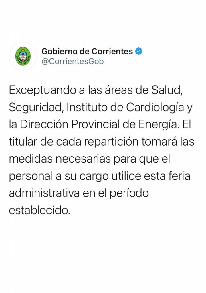 A través del Decreto 1485, el gobernador Gustavo Valdés determinó la feria administrativa de invierno para el personal de las reparticiones de la administración pública provincial central, organismos descentralizados y autárquicos, la que será utilizada por los agentes en uno de los períodos comprendidos, entre el 12 y el 16 de julio de 2021, y el 19 y el 23 de julio de 2021, respectivamente, con excepción de las áreas de Salud, Seguridad, el Instituto de Cardiología y la Dirección Provincial de Energía (DPEC), en las que cada titular de dichas reparticiones tomará las medidas necesarias para que el personal a su cargo utilice esta feria administrativa en el período establecido.