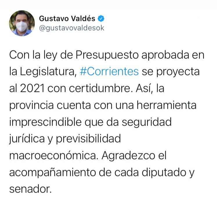 “Con la ley de Presupuesto aprobada en la Legislatura, Corrientes se proyecta al 2021 con certidumbre. Así, la provincia cuenta con una herramienta imprescindible que da seguridad jurídica y previsibilidad macroeconómica. Agradezco el acompañamiento de cada diputado y senador, tuiteó Valdés.