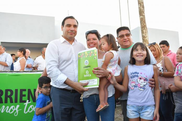 El gobernador Gustavo Valdés entregó este lunes 100 viviendas en el barrio Aeroclub de la ciudad de Goya, valorando la familia como núcleo básico de la sociedad. “Lo más importante que tiene la sociedad es la familia”, dijo allí el Mandatario junto al intendente local, Ignacio Osella y anunció la construcción de otras 50 unidades habitacionales más en la localidad, ratificando a la vez su compromiso de “hacer juntos una hermosa ciudad”.