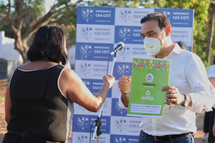 El gobernador de la provincia Gustavo Valdés se hizo presente en la localidad de Caá Catí para hacer entrega junto con el intendente Jorge Meza de viviendas con todas las comodidades para 10 familias del nuevo barrio María Auxiliadora. También, firmó un convenio con el municipio para la construcción de 10 viviendas más con la provisión de todos los materiales para su ejecución.