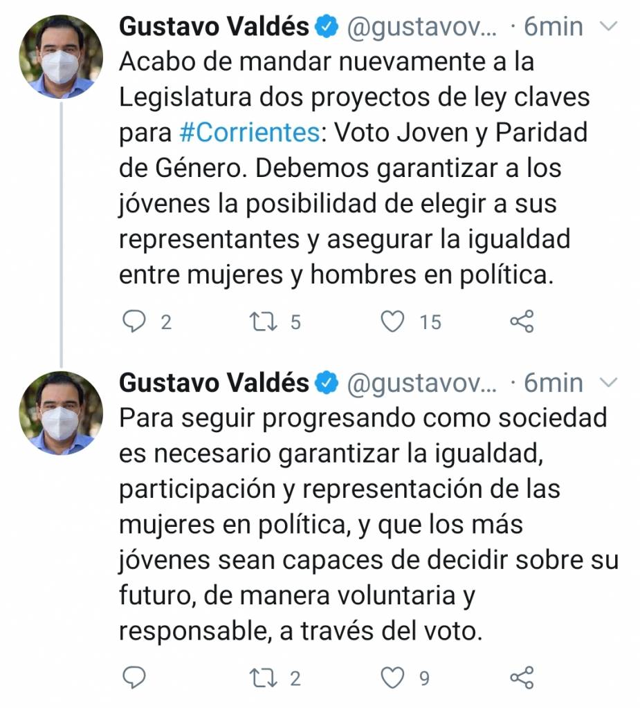 En su cuenta de Twitter, el Mandatario provincial escribió: “Acabo de mandar nuevamente a la Legislatura dos proyectos de ley claves para Corrientes: Voto Joven y Paridad de Género”. Y seguidamente, justificó su decisión manifestando que “para seguir progresando como sociedad es necesario garantizar la igualdad, participación y representación de las mujeres en política, y que los más jóvenes sean capaces de decidir sobre su futuro, de manera voluntaria y responsable, a través del voto”.