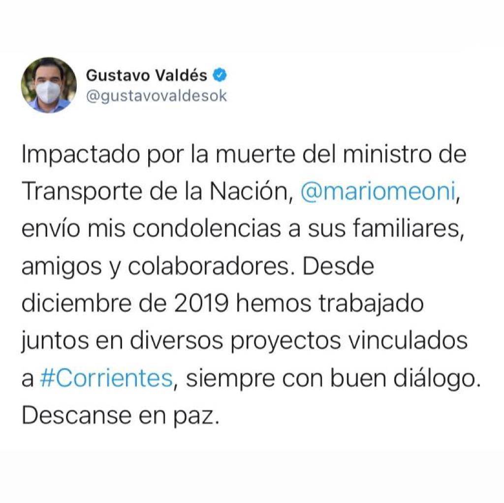 “Impactado por la muerte del ministro de Transporte de la Nación, @mariomeoni, envío mis condolencias a sus familiares, amigos y colaboradores. Desde diciembre de 2019 hemos trabajado juntos en diversos proyectos vinculados a #Corrientes, siempre con buen diálogo. Descanse en paz.”, tuiteó Valdés.