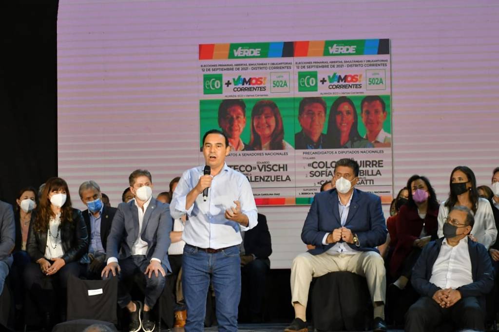 El reelecto gobernador Gustavo Valdés pidió este jueves el acompañamiento en las PASO de este domingo a la Lista Verde 502 A de ECO+Vamos Corrientes, porque “necesitamos un país federal que distribuya a cada provincia los recursos que les corresponde”. Fue en el cierre de campaña que encabezó el Mandatario en el club San Martín de la capital provincial, donde aseguró que los candidatos con los que compartió escenario en la ocasión, “son los que necesita la provincia para seguir creciendo”, garantizando que no caerán en el centralismo de la Nación y representarán verdaderamente los intereses de Corrientes, pugnando en el Congreso por los fondos y las obras de infraestructura para el desarrollo local.