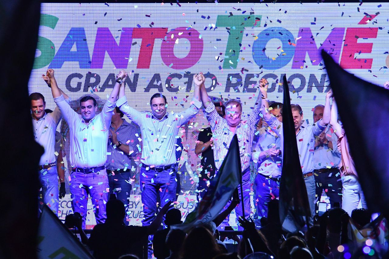 Alrededor de las 21 y ante una multitud calculada en 10 mil personas, el reelecto gobernador llegó al club santotomeño “27 de Agosto” para dar inicio al acto de ECO+Vamos Corrientes, con la fórmula a intendente y vice de Augusto Suaid y Carlos Farizano, respectivamente, como anfitriones, junto a los aspirantes a ediles Mirta Riveros, Gerard Romero Sosa, Gabriela Ponce, Jun Centeno, Chipi Braña, y Esteban Rey Avalos. También tomaron parte, los candidatos a senadores nacionales, Eduardo Vischi y Gabriela Valenzuela; y a diputados nacionales, Manuel Aguirre, Sofía Brambilla y Carlos Gatti; más el senador nacional y vicegobernador electo, Pedro Braillard Poccard y los presidentes de varios de los 32 partidos que integran la alianza.