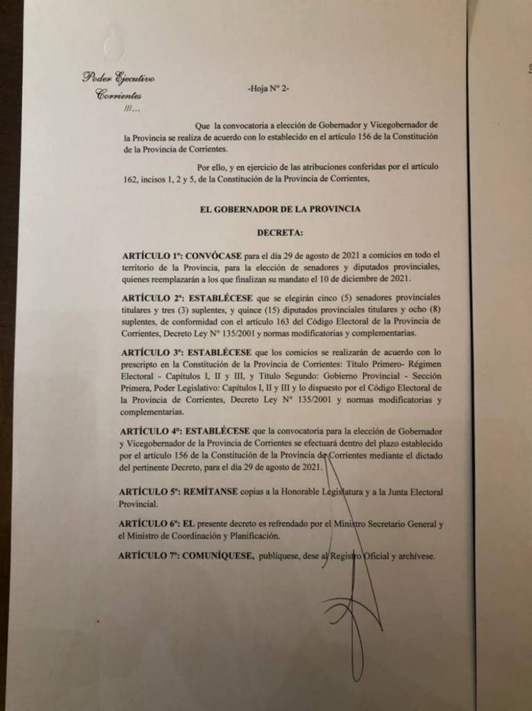 En la normativa se establece en el primer artículo la fecha para los comicios legislativos en el último domingo de agosto. Mientras que en el cuarto artículo se confirma los comicios a Gobernador.