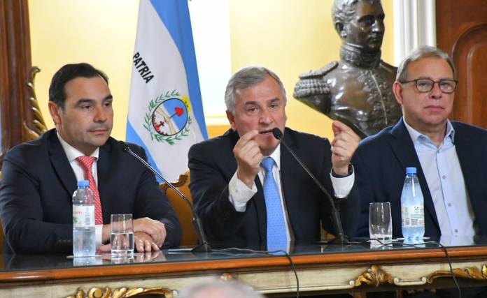 Valdés encabezó la conferencia de prensa junto a Morales, al vicegonbernador Pedro Braillard Poccard y al intendente de Capital, Eduardo Tassano.