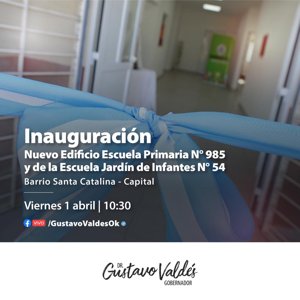 El gobernador Gustavo Valdés recibirá este viernes a las 9,30 al ministro de Educación de la Nación, Jaime Perczyk, en la Casa de Gobierno para firmar convenios en un acto que se desarrollará en el Salón Amarillo. Luego, a las 10,30, ambos encabezarán la inauguración de los nuevos edificios de la Escuela Primaria Nº 985 y de la Escuela Jardín de Infantes Nº 54, ubicados en el barrio Santa Catalina de la ciudad de Corrientes.