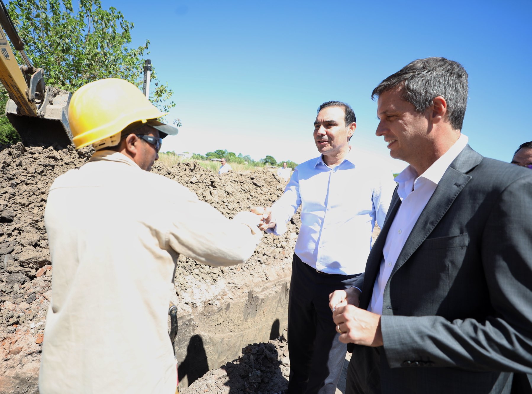 En el marco de la visita a Corrientes del administrador del Ente Nacional de Obras Hídricas de Saneamiento (ENOHSA), Enrique Cresto, el gobernador Gustavo Valdés recorrió este lunes junto al mencionado funcionario los trabajos que se llevan adelante en Riachuelo, y que beneficiará a más de 2900 familias. Consiste en la construcción de red cloacal, más una laguna de tratamiento de líquidos cloacales, entre otras tareas.