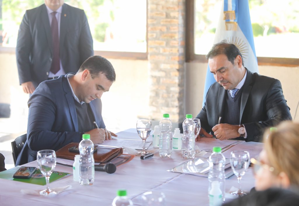 El gobernador Gustavo Valdés junto al intendente de Santo Tomé Augusto Suaid tras la intensa agenda de actividades desarrolladas, este jueves suscribió cuatro Convenios de Cooperación en pos del crecimiento para la localidad.