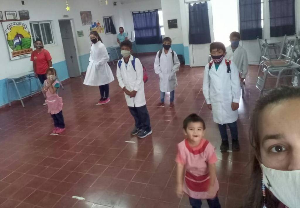 La maestra comentó en radio La Red Corrientes, que cuenta con 18 alumnos y que da a todos la clase al mismo tiempo. Cuenta con pizarra y pizzaron a los cuales divide en tres, allí realiza las explicaciones pertinentes para cada nivel. ” Tenemos un salón grande, mantenemos la distancia por la pandemia. Entre todos se ayudan. Cuando parte de los alumnos miran al frente los demás continúan con su actividades”, explicò.