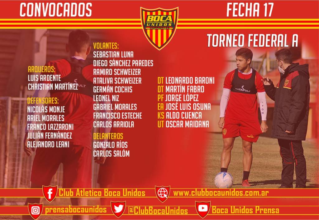 Boca Unidos: Luis Ardente; Nicolás Monje, Julián Fernández, Ariel Morales y Alejandro Leani; Diego Sánchez Paredes y Ataliva Schweizer; Gonzalo Ríos, Gabriel Morales y Germán Cochis; Carlos Salom. DT: Leonardo Baroni y Martín Fabro.