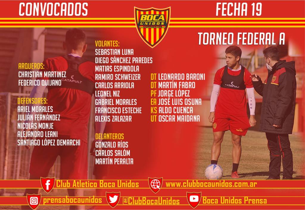 Luego del táctico de esta mañana, la dupla técnica de Boca Unidos conformada por Leonardo Baroni y Martín Fabro dieron a conocer la lista de convocados que viajará esta noche rumbo a Concepción del Uruguay .