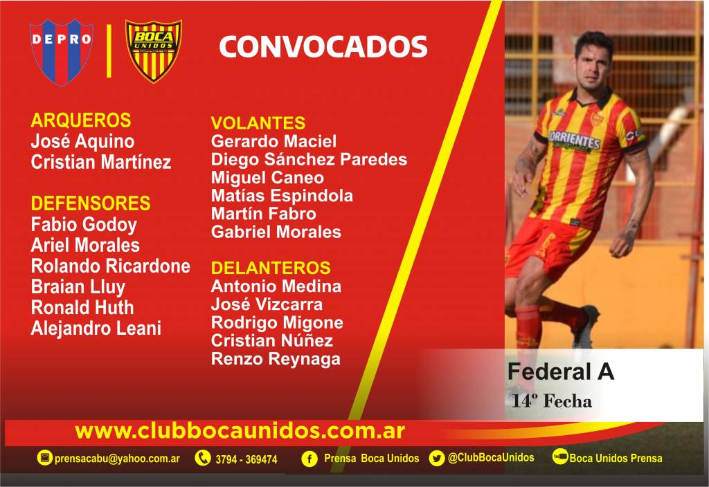 Dentro de la lista se destaca la presencia de Martín Fabro –aún no está para ser titular- y la recuperación de Miguel Caneo, quien será parte de la delegación tras algunas semanas ausentes por lesión. También está a disposición del entrenador José Vizcarra quien se quedó afuera, a último momento, el partido pasado por una sobrecarga muscular.