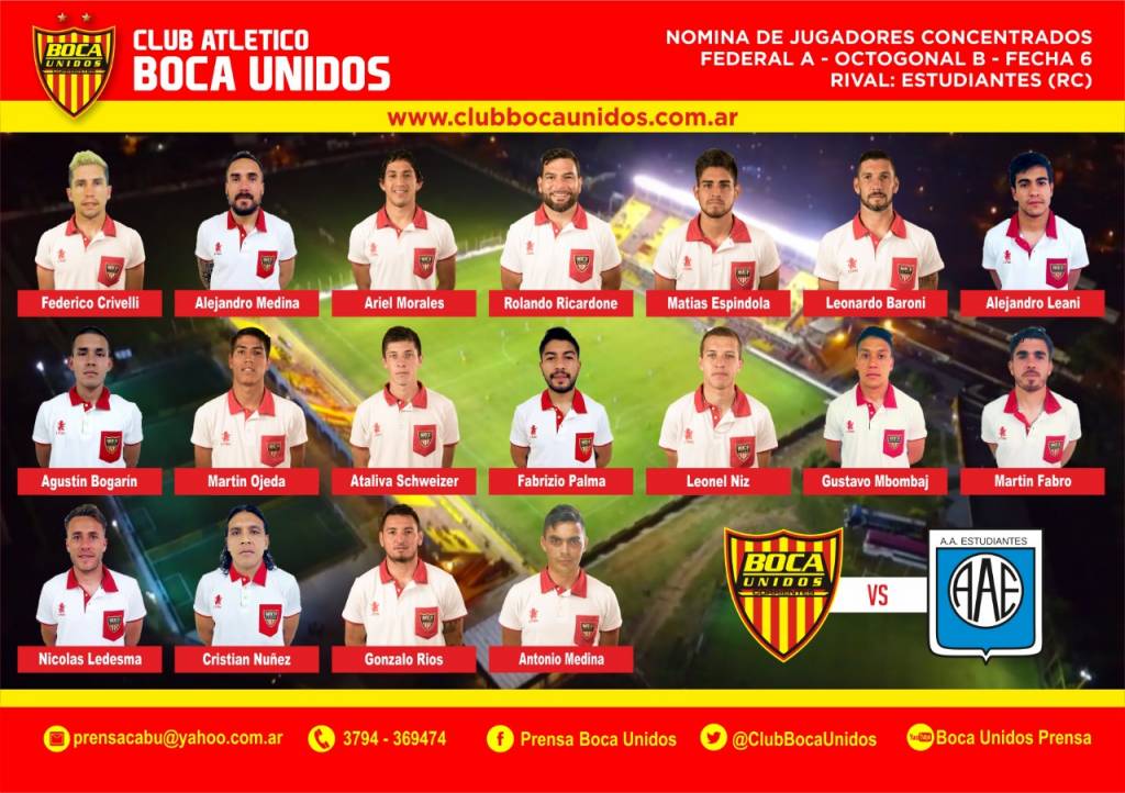 Boca Unidos: Alejandro Medina; Matías Espíndola, Rolando Ricardone, Ariel Morales y Alejandro Leani; Fabrizio Palma, Martín Ojeda, Martín Fabro y Gustavo Mbombaj; Cristian Núñez y Nicolás Ledesma. DT: Carlos Mayor.