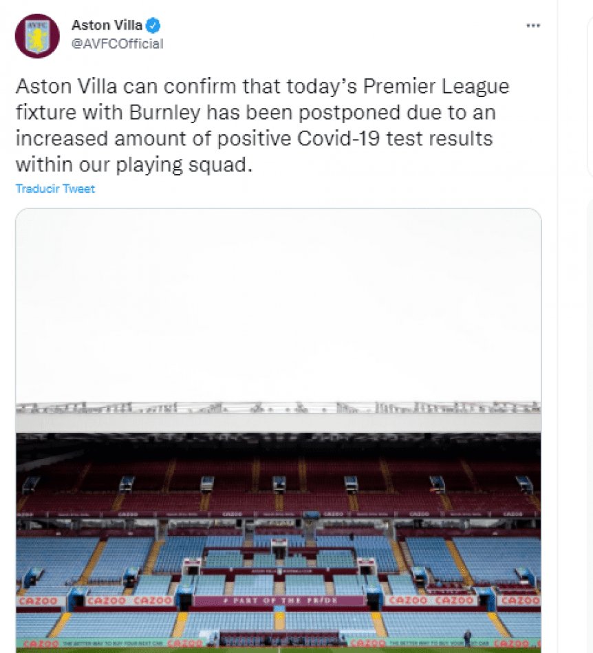 El coronavirus golpea cada vez más en Inglaterra y se siente en la Premier League. Ahora, el Aston Villa (donde juegan Emiliano Martínez y Emiliano Buendía) informó un brote de coronavirus dentro del plantel y la suspensión del partido contra el Burnley, que debía jugarse este sábado desde las 12 del mediodía (hora de Argentina).