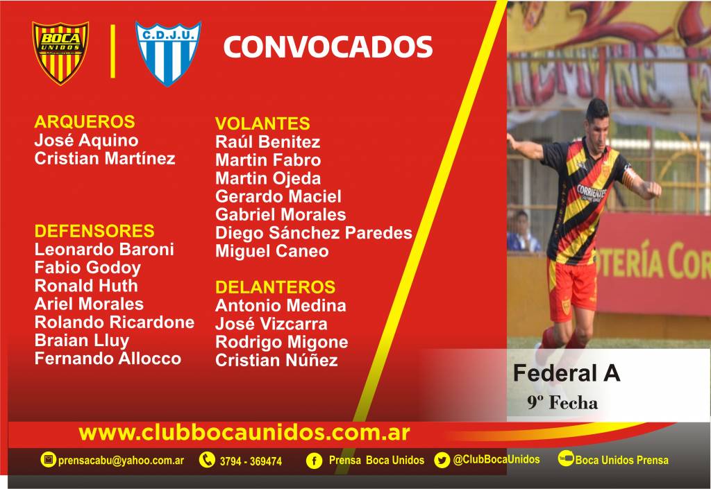 Boca Unidos recibirá este jueves a Juventud Unida de Gualeguaychú, en uno de los partidos de la novena fecha de la Zona A del Federal A. Será desde las 21.30, con el arbitraje de Héctor Rivero de Santiago del Estero. Vuelve Fabro y Teglia tiene un par de dudas.