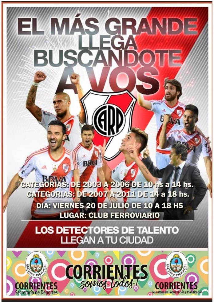 La Secretaría de Deportes de la Provincia informa que el próximo viernes 20 de julio de 10 a 18 hs, el Club Atlético River Plate realizará una “Prueba Regional de Juveniles” para la búsqueda de talentos.