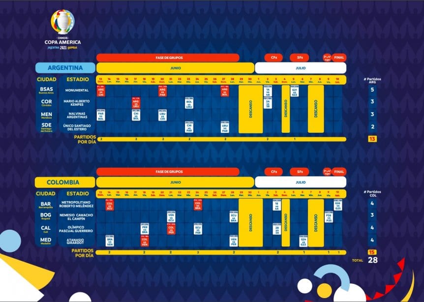 La Selección Argentina jugará el partido inaugural el domingo 13 de junio en el Monumental ante Chile, mientras que la final tendrá lugar el sábado 10 de julio en Barranquilla.