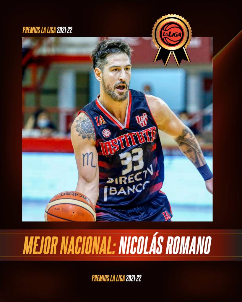 Nicolás Romano, quien ocupa el mismo rol en Instituto de Córdoba, fue elegido como el “Mejor jugador nacional”, reuniendo el 54,5% de los sufragios. MVP del pasado Súper 20, desde principios de la 2021/22 es una pieza clave en la estructura de la Gloria, sobresaliendo como parte de un equipo con mucho renombre. El juninense de 34 años, que fue campeón con San Lorenzo en la temporada pasada, brilla en su regreso a Instituto con números de 14.0 puntos y 7.2 de media. Su actual nivel le valió convocatorias a la Selección Argentina.