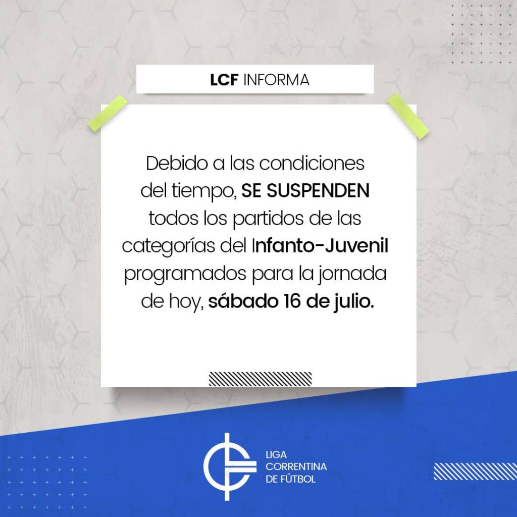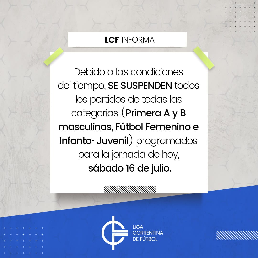La Liga Correntina de Fútbol anunció la suspensión de toda la actividad debido a la lluvia con la que amaneció la ciudad. En la reunión del martes se llevará a cabo la reprogramación. Lo de mañana, por el momento, sigue firme. Lo suspendido podría reprogramarse para el miércoles 20.