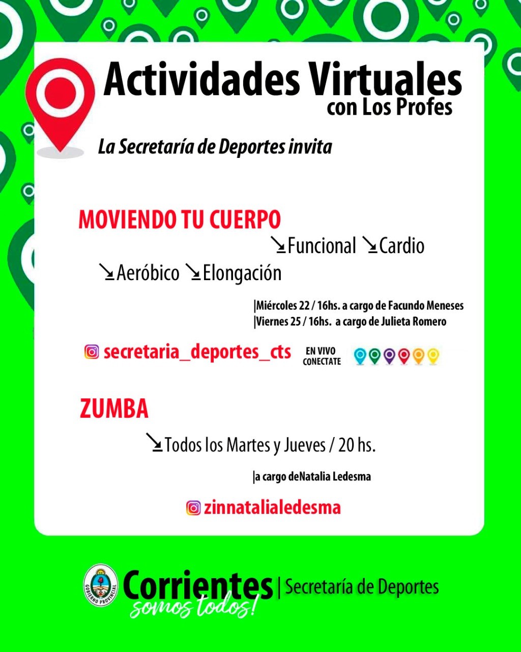 Las clases de “Moviendo tu Cuerpo”, inician hoy miércoles 22 de abril, y se extenderán todos los lunes, miércoles y viernes de cada semana, desde las 16 horas  en vivo, por la cuenta de Instagram Oficial: secretaria_deportes_ctes.