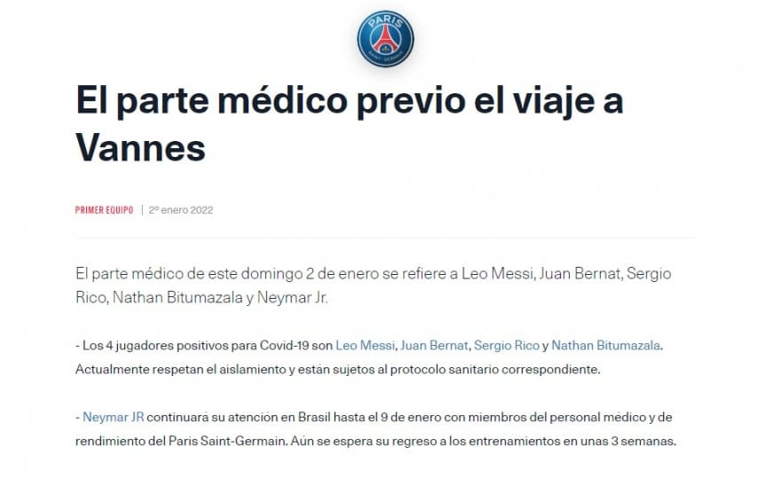 Lionel Messi es uno de los cuatro jugadores del plantel de PSG que tienen Covid, según lo informó esta mañana el propio club mediante un comunicado que publicó en sus redes sociales. Los otros futbolistas afectados por el coronavirus son Juan Bernat, Sergio Rico y Nathan Bitumazala.