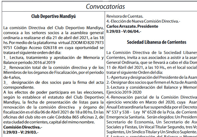 Luego de cumplir con los requisitos del Estatuto, la Asamblea se llevará a cabo el miércoles 21 de abril y bajo la plataforma virtual Zoom, desde las 18. Allí se buscará la aprobación de la Memoria y Balance de 2016 a 2019.