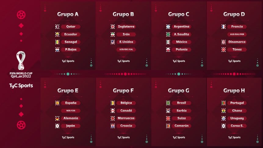 En tanto, el ganador del repechaje intercontinental entre Perú, Emiratos Árabes Unidos (EAU) y Australia estará en el Grupo D, que encabeza Francia y tiene a Dinamarca y Túnez. El vencedor de Costa Rica o Nueva Zelanda completará el Grupo E de España, Alemania y Japón.
