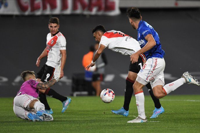 El encuentro inició con una ráfaga de River. En menos de diez minutos, ya ganaba 2-0. Primero, a los cinco minutos de juego, Matías Suárez quedó mano a mano con Federico Lanzillota y se la pinchó por arriba para marcar un golazo. Luego, a los 9′, Enzo Fernández remató desde afuera del área y venció la resistencia del arquero del Bicho, quien pudo ser perjudicado por el gran diluvio de este momento en Núñez.