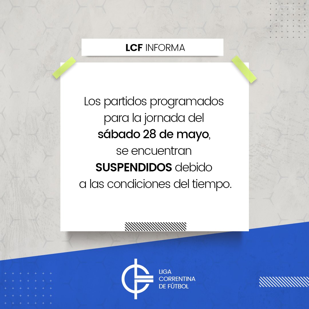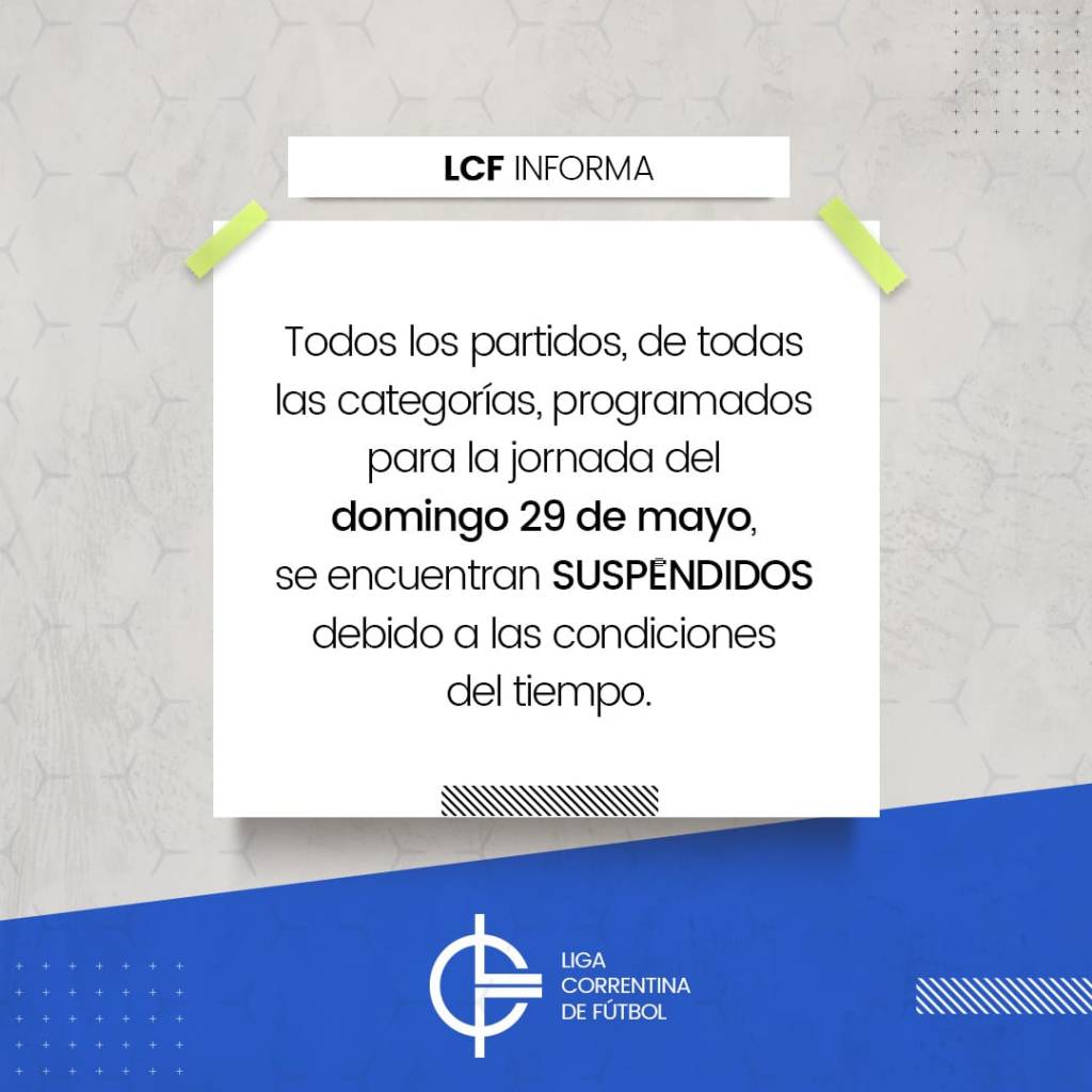 La Liga Correntina de Fútbol (LCF) emitió un comunicado -vía redes sociales- en el que anuncian la suspensión de la jornada sabatina. Luego dió a conocer que también se suspende lo previsto para la B.