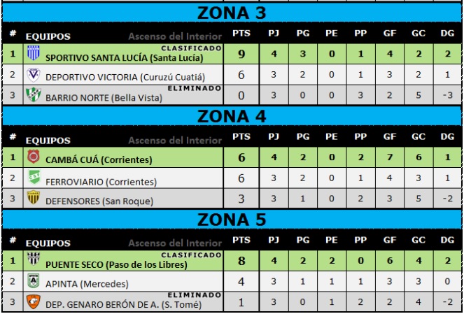 Sportivo Santa Lucía y Puente Seco de Paso de los Libres se metieron en la próxima instancia del certamen que organiza el Consejo Federal luego de vencer a Victoria de Curuzú Cuatiá y Berón de Astrada, respectivamente, y ambos por 1 a 0. Resta la definición de la zona 4 donde están los capitalinos. Mirá las posibilidades.