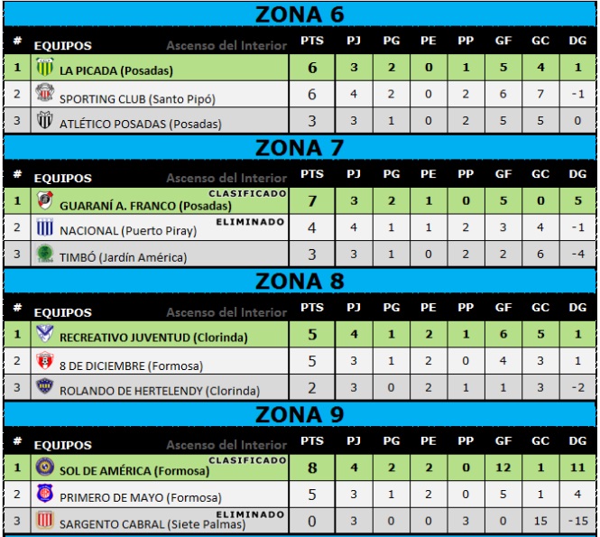 En la zona 6, Sporting (6 pts / -1) quedará libre y quedaría eliminado ya que si empatan La Picada (6 pts / +1) será segundo; y si gana Atlético Posadas (3 pts / 0) o superará en diferencia de gol.