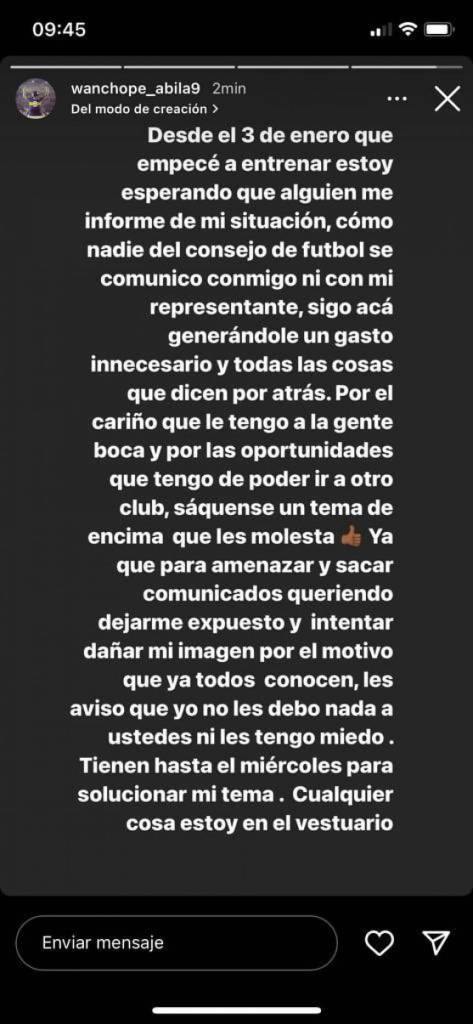 Ya que para amenazar y sacar comunicados queriendo dejarme expuesto e internar dañar mi imagen por el motivo que ya todos conocen, les aviso que yo no les debo nada a ustedes, ni les tengo miedo. Tienen hasta el miércoles para solucionar mi tema. Cualquier cosa estoy en el vestuario”.