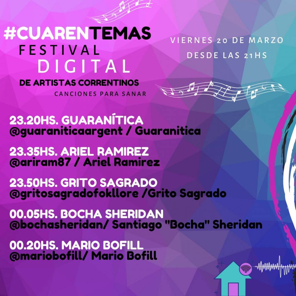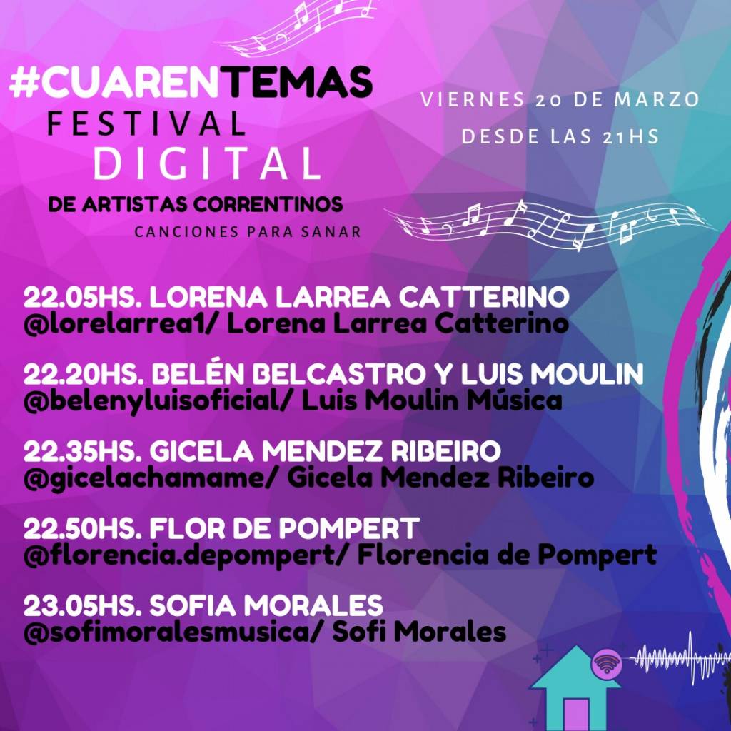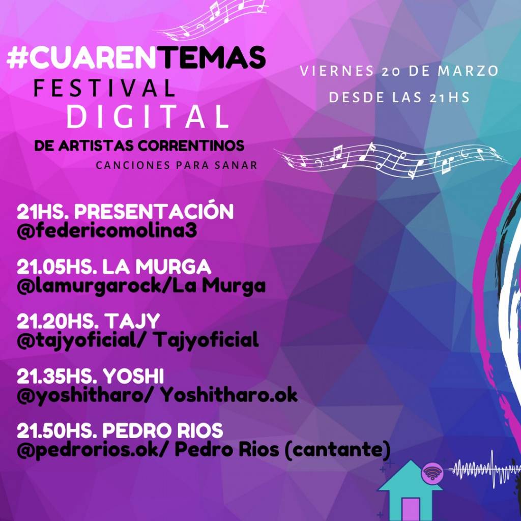🗓Este Viernes 20 desde las 21hs se realizará el Primer Festival Digital de artistas llamado “CuarenTemas” para acompañar la cuarentena y sanar con canciones.