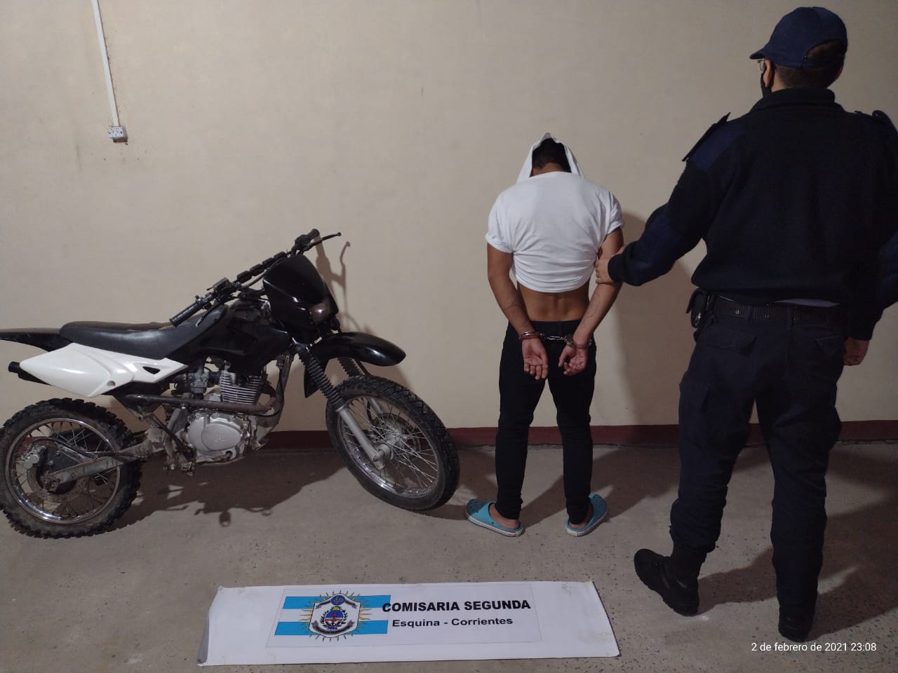 Un joven de 22 años de edad, fue aprehendido por Efectivos Policiales de la Comisaría de Distrito Segunda de Esquina, debido a que en principio estaría vinculado a la supuesta sustracción de una motocicleta del interior de un domicilio del Barrio Itati de esa ciudad, ocurrido este domingo y la cual fue recuperada.