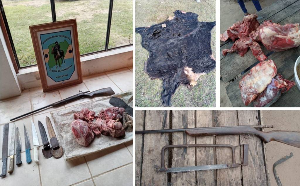 Asimismo, en la oportunidad procedieron al secuestro de un cuero vacuno; cuchillos varios; y una escopeta y además aprehendieron a un joven de 22 años de edad, todo ello “a prima facie”, relacionado con lo investigado.