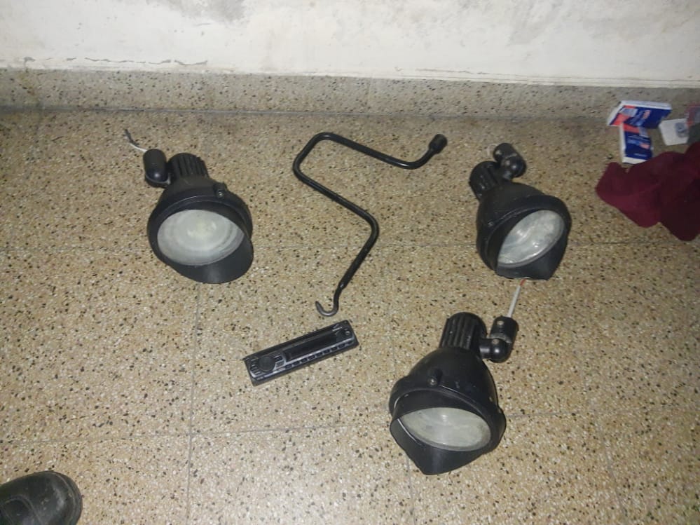de dudosa procedencia como ser: 3 tipo reflectores, una tapa de estéreo, una llave tuerca-gancho.